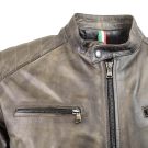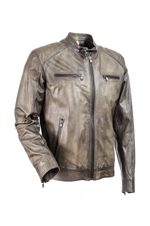 Giubbotto di pelle tamponato a mano con chiusura zip e bottone a pressione, quattro tasche con chiusura zip.