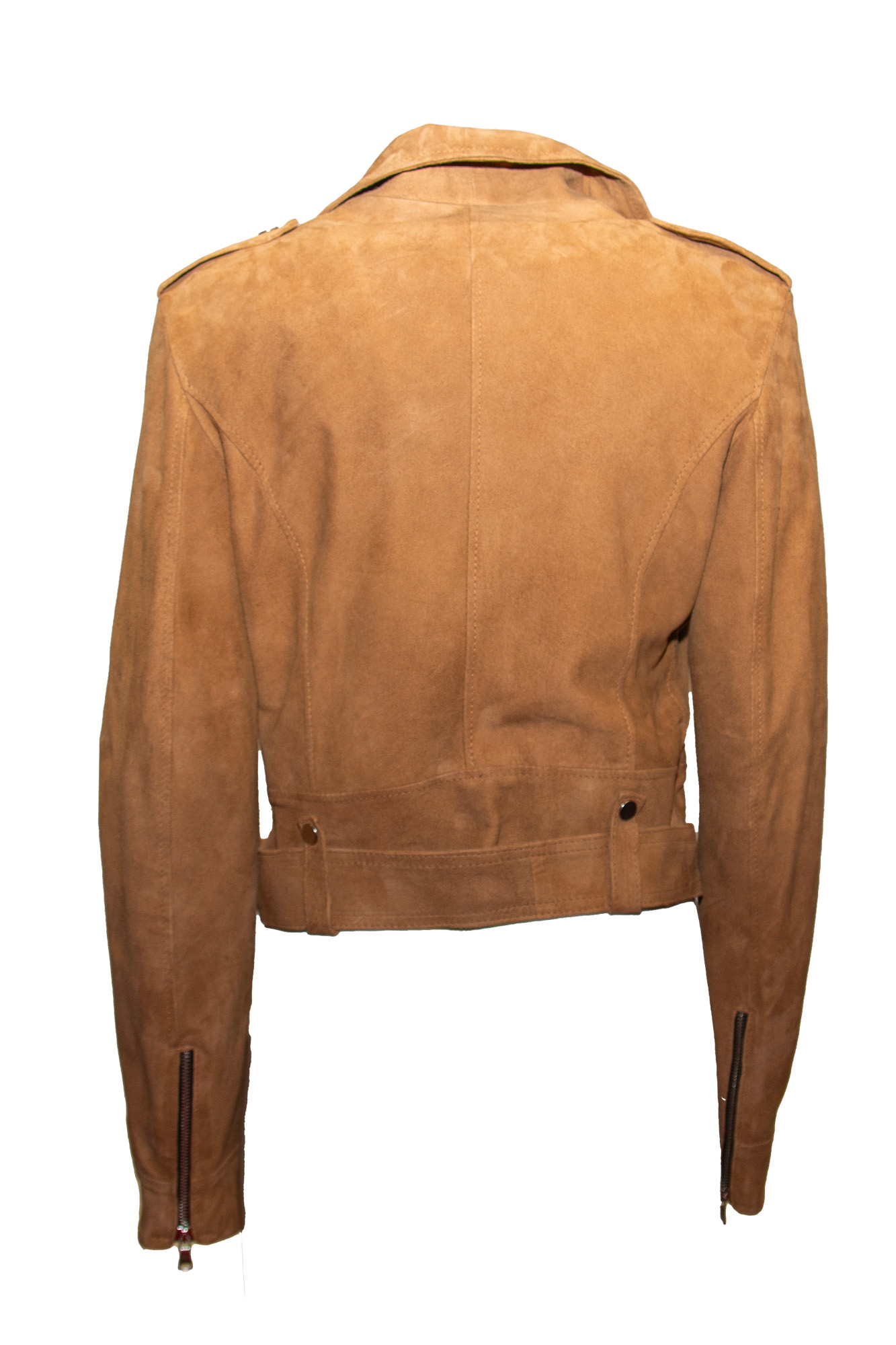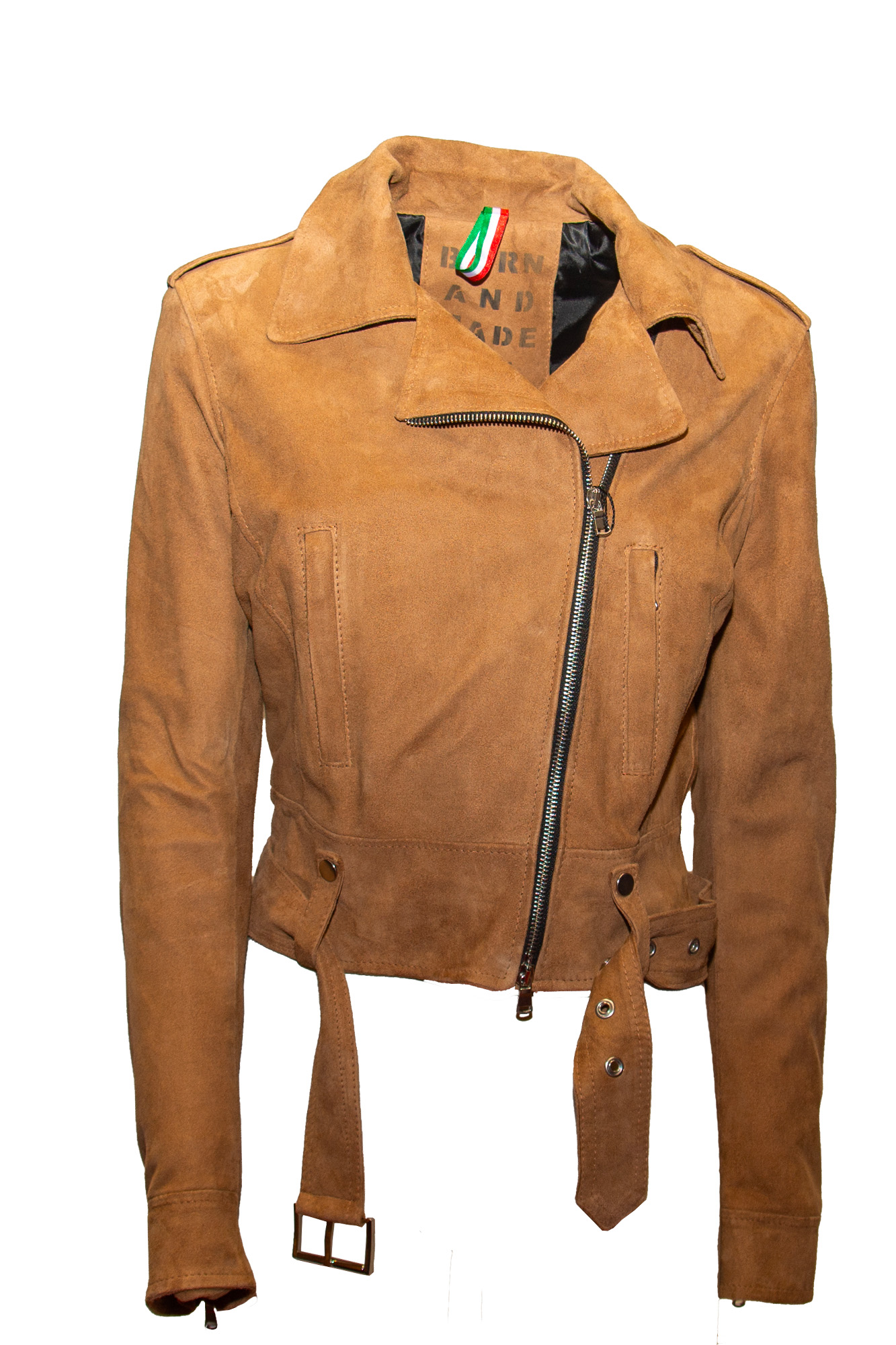 Giacca di pelle tamponato a mano, chiusura zip trasversale, tasche con chiusura zip, colletto, cintura.