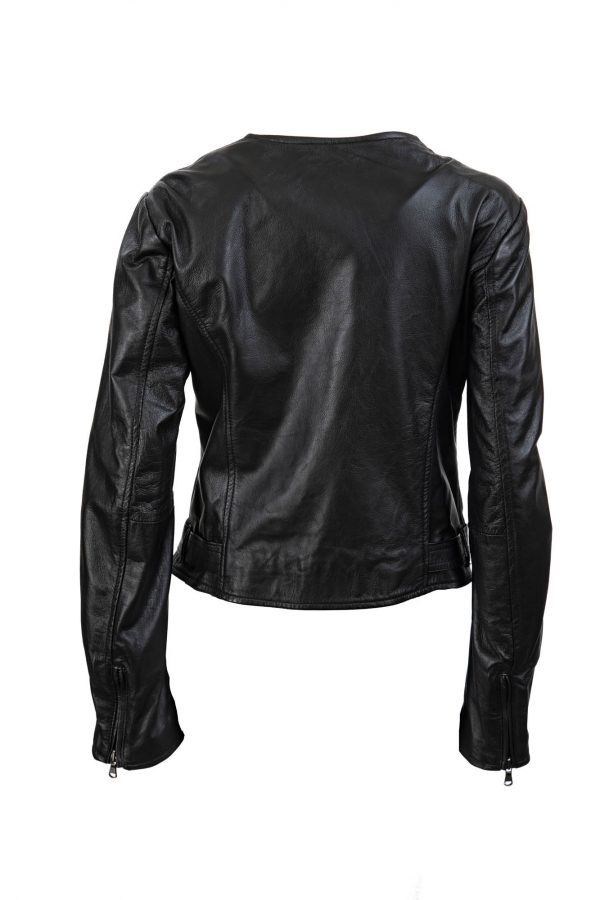 Giubbotto di pelle, modelo bikers, chiusura con zip trasversale, cintura.