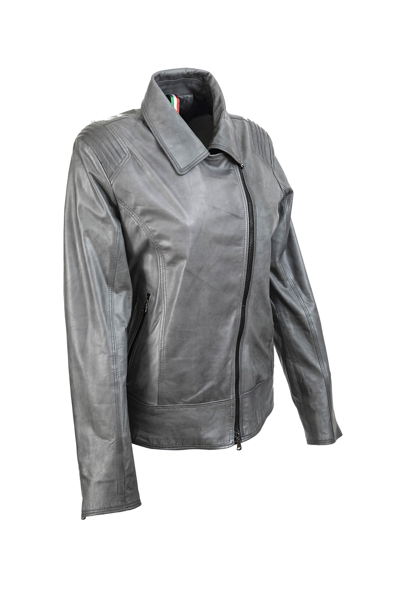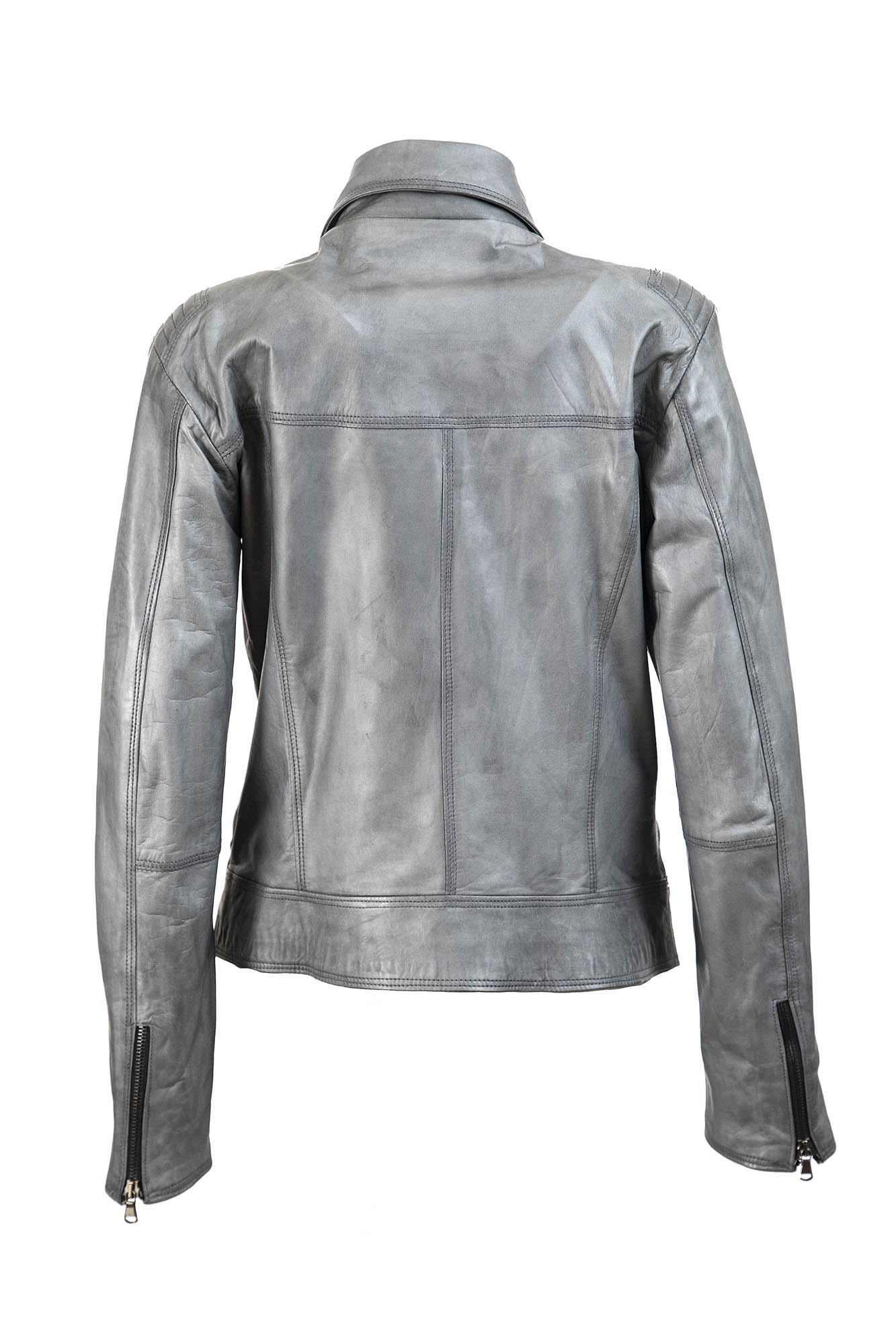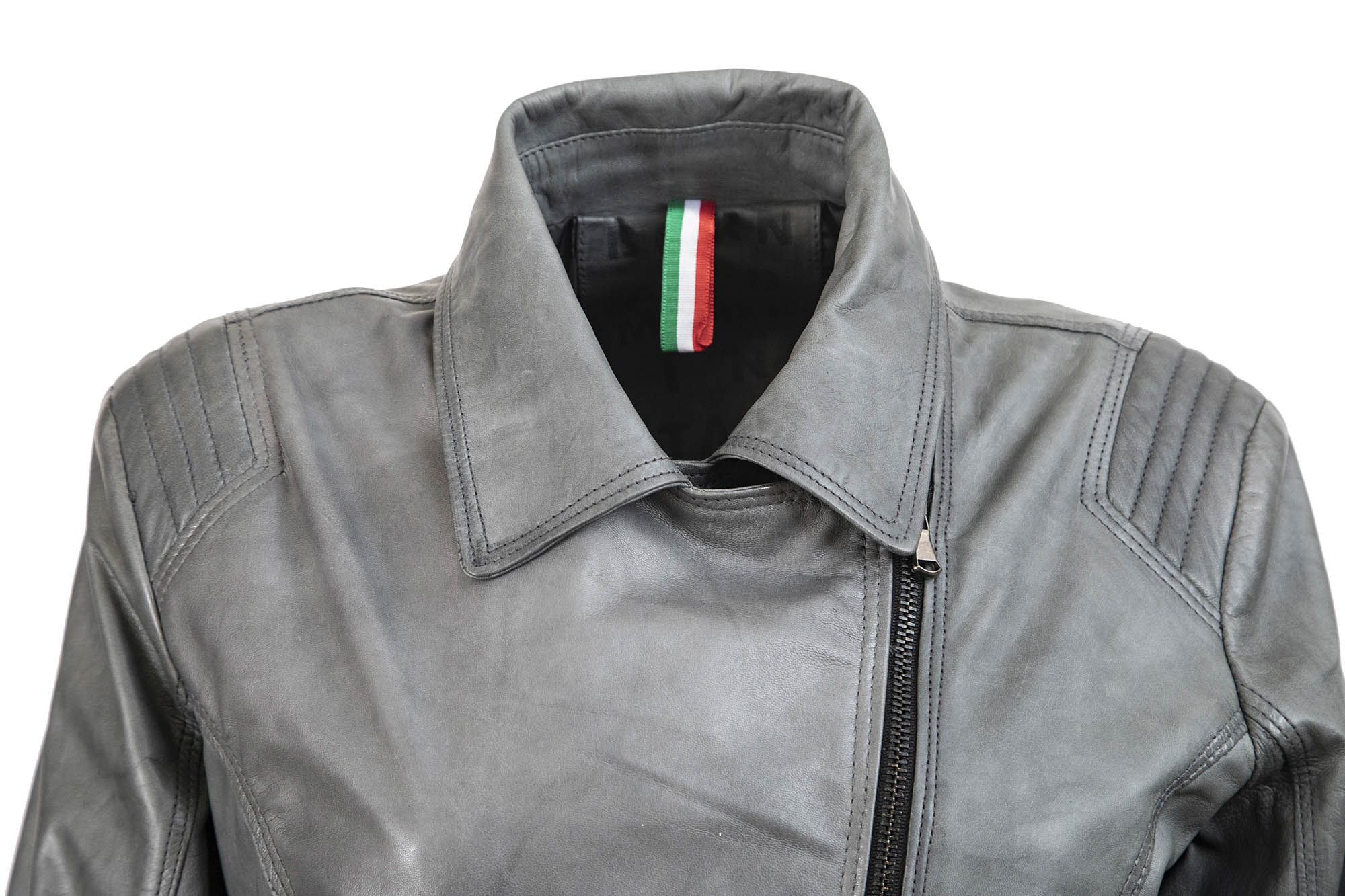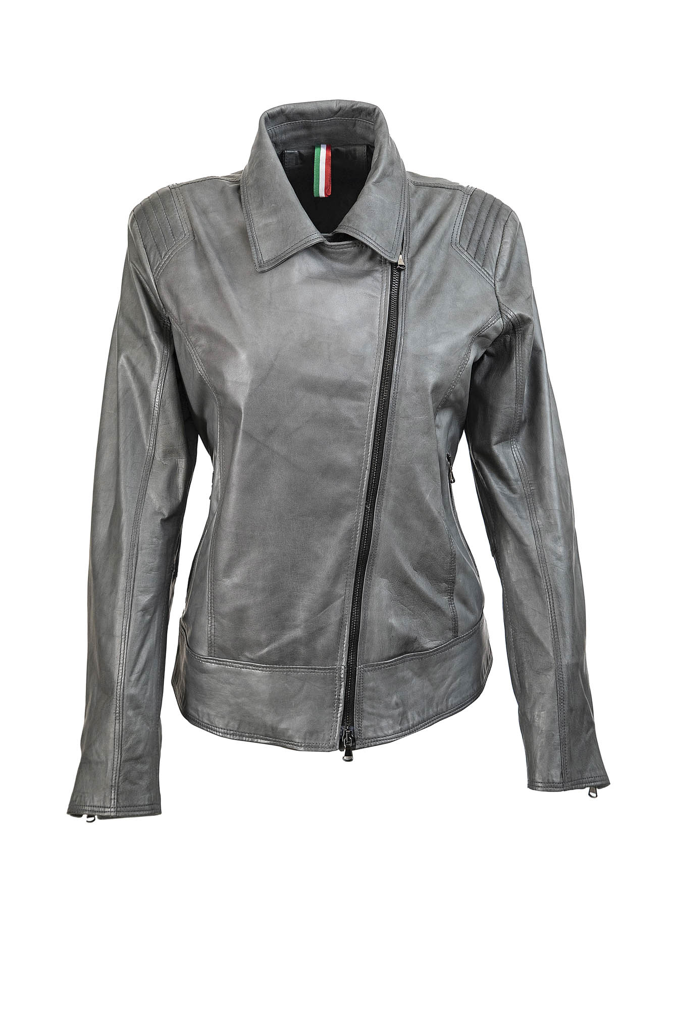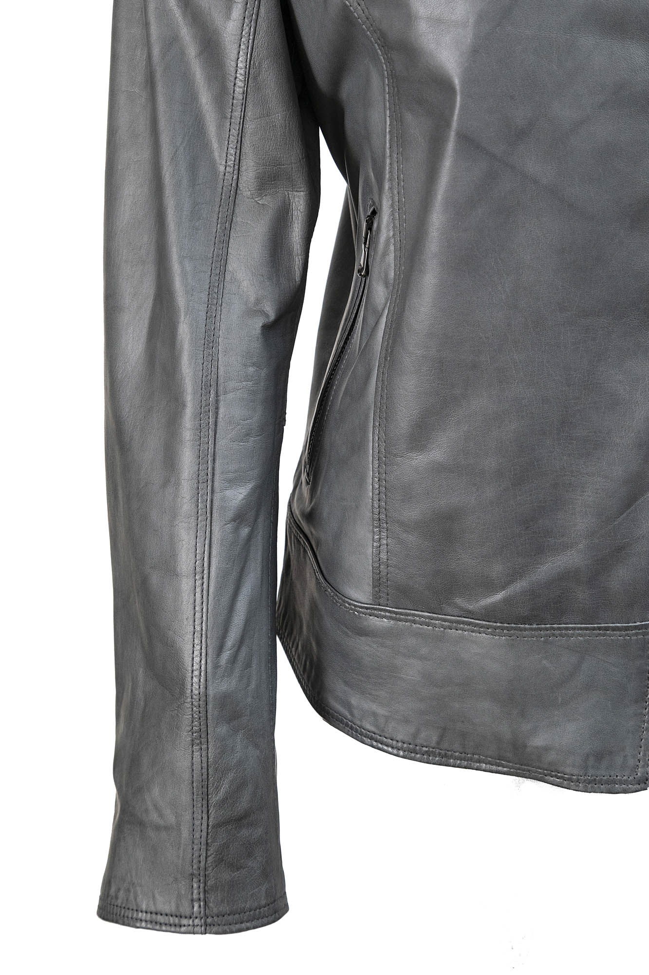 Giubbotto di pelle tamponato a mano, chiusura con zip trasversale, colletto.
