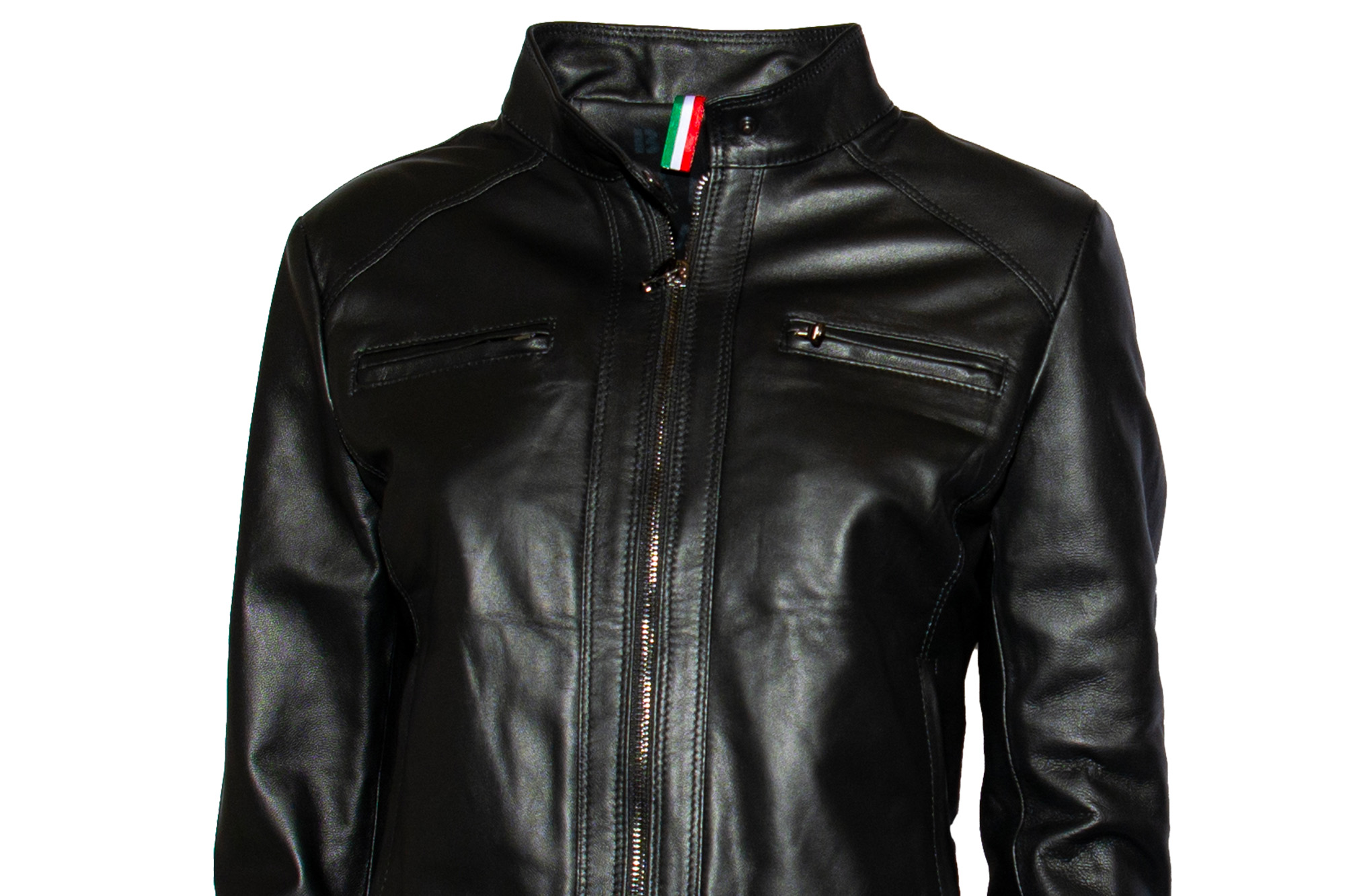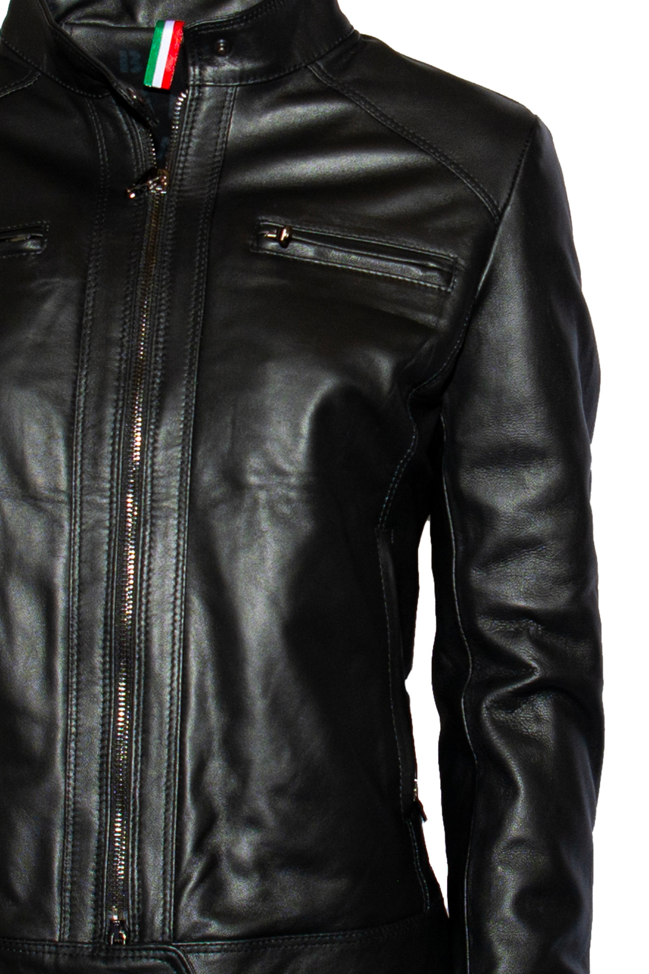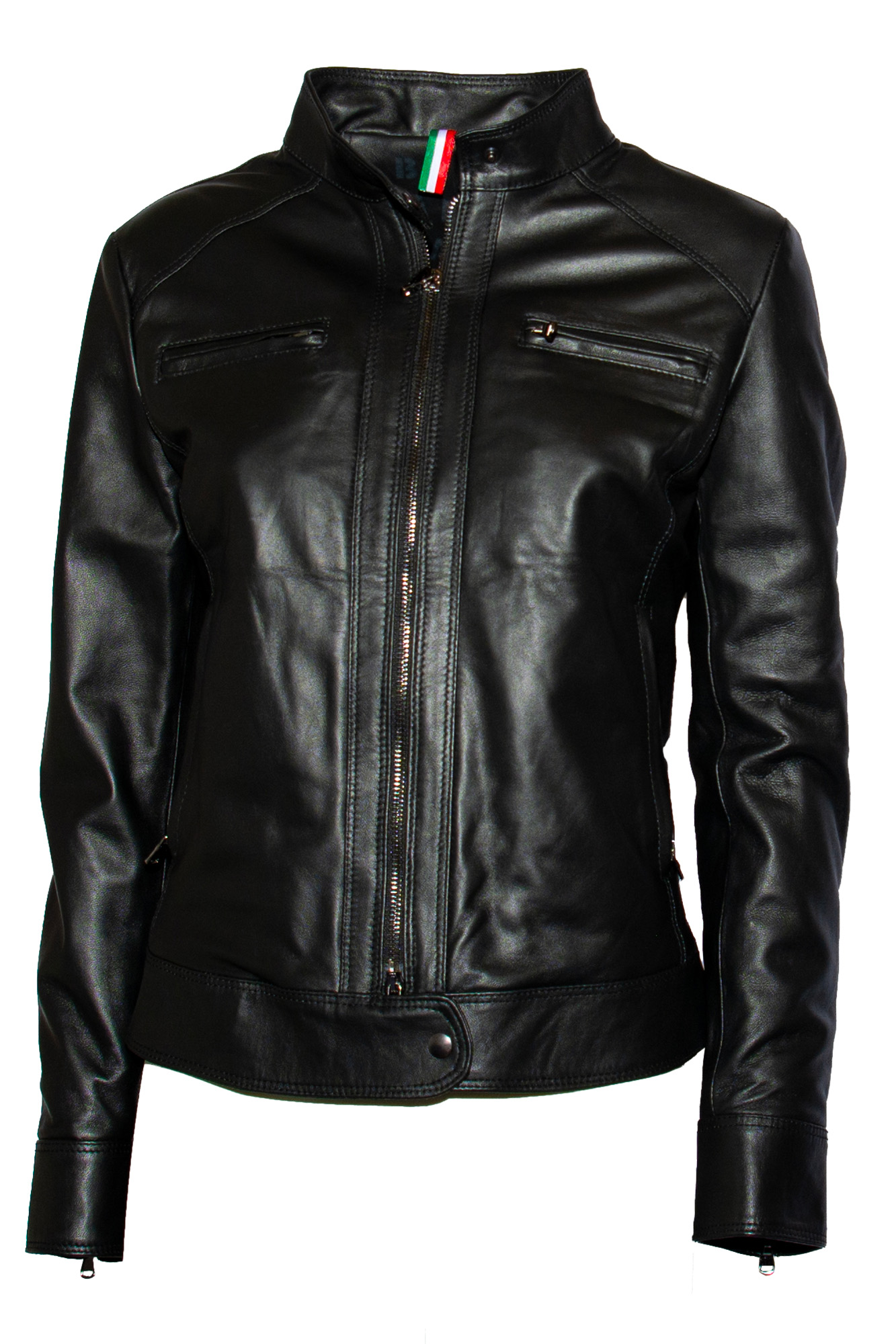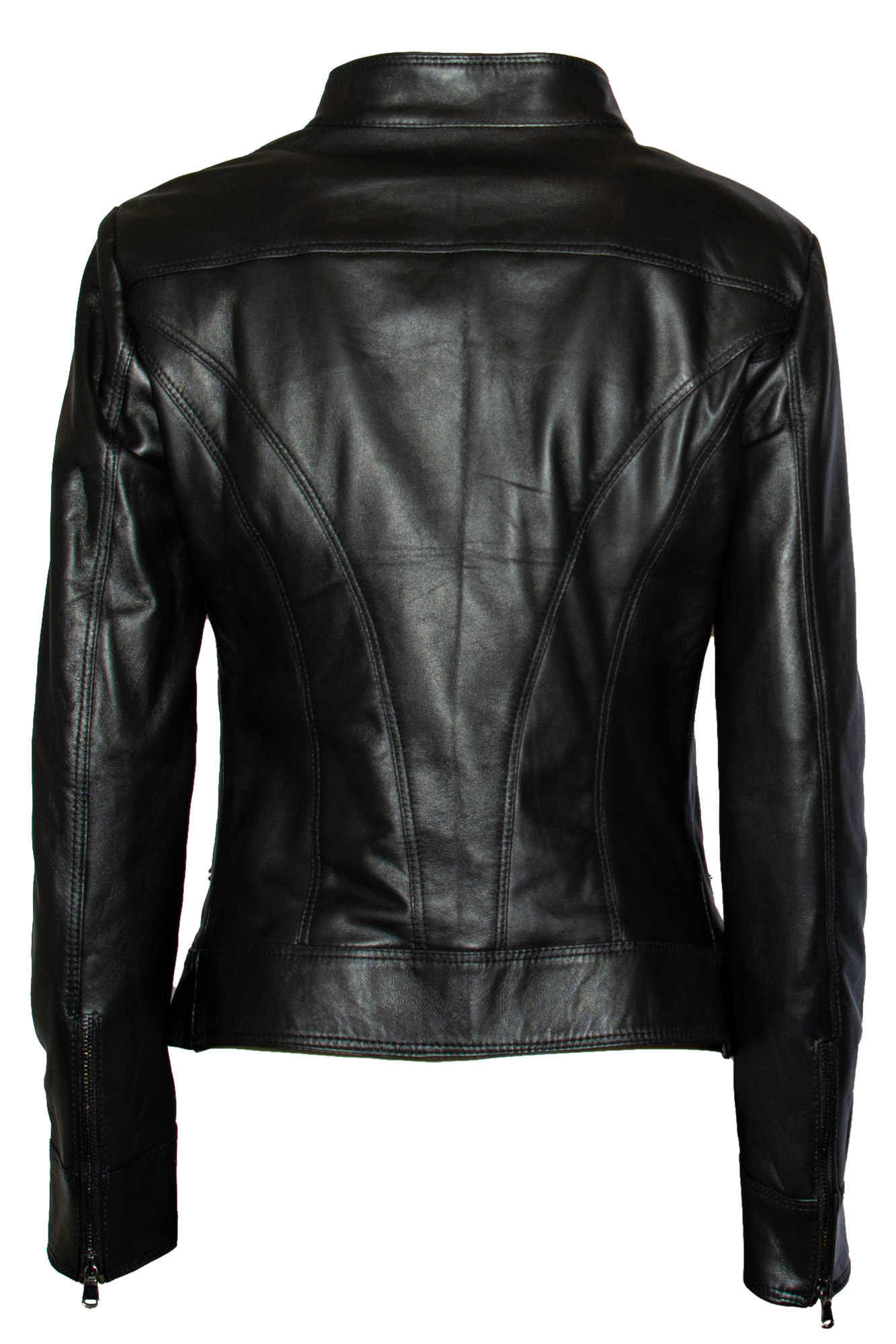Giacca di pelle, chiusura con zip, quattro tasche con chiusura zip, senza colletto.