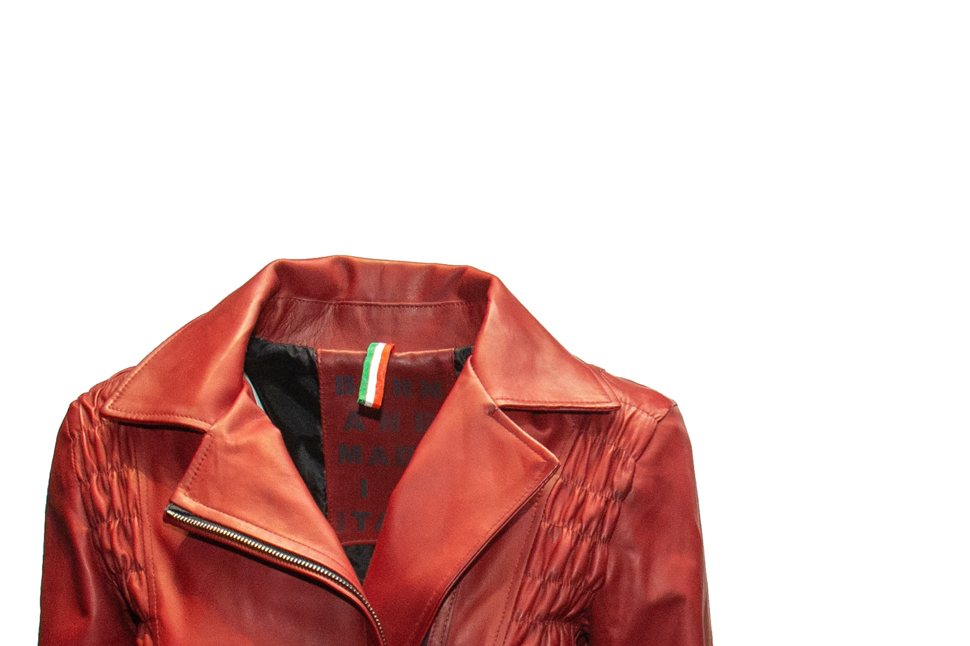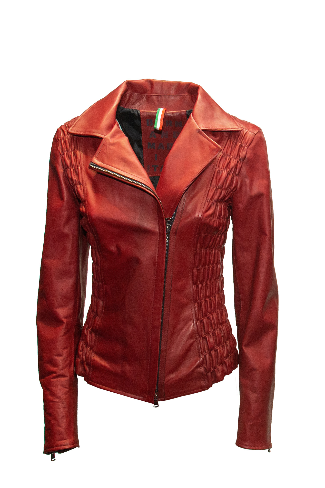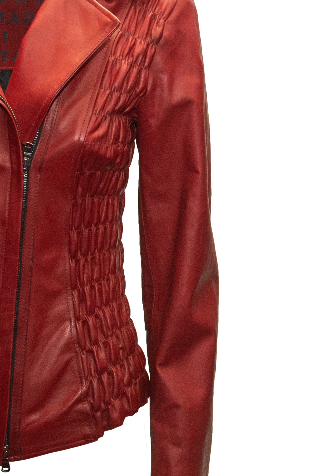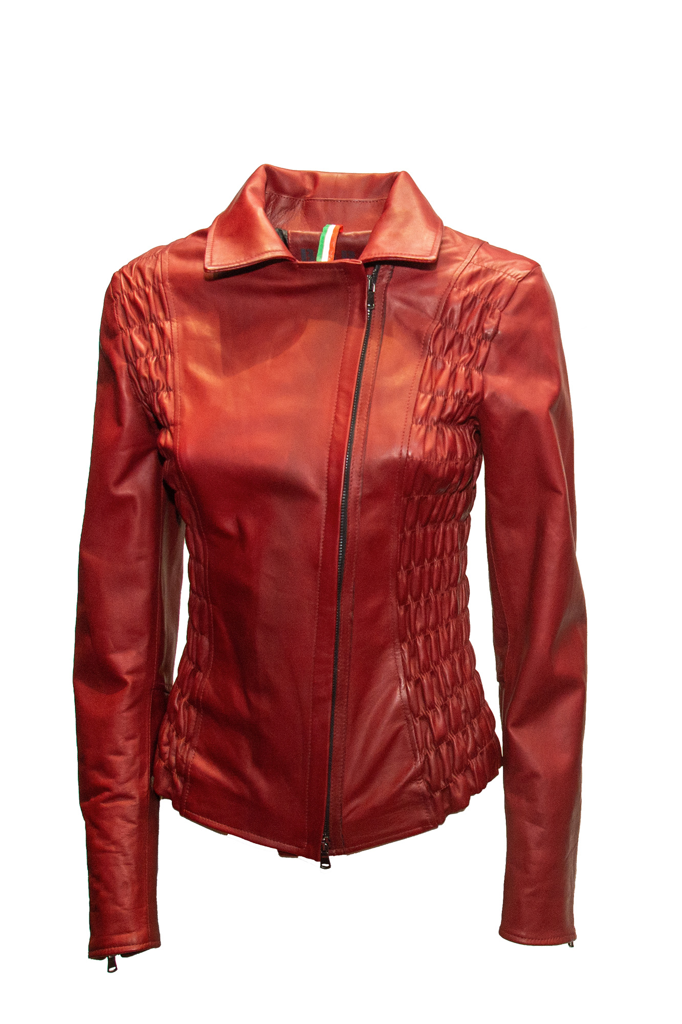 Giacca di pelle tamponato a mano, chiusura zip trasversale, colletto, laterali goffrati.