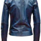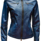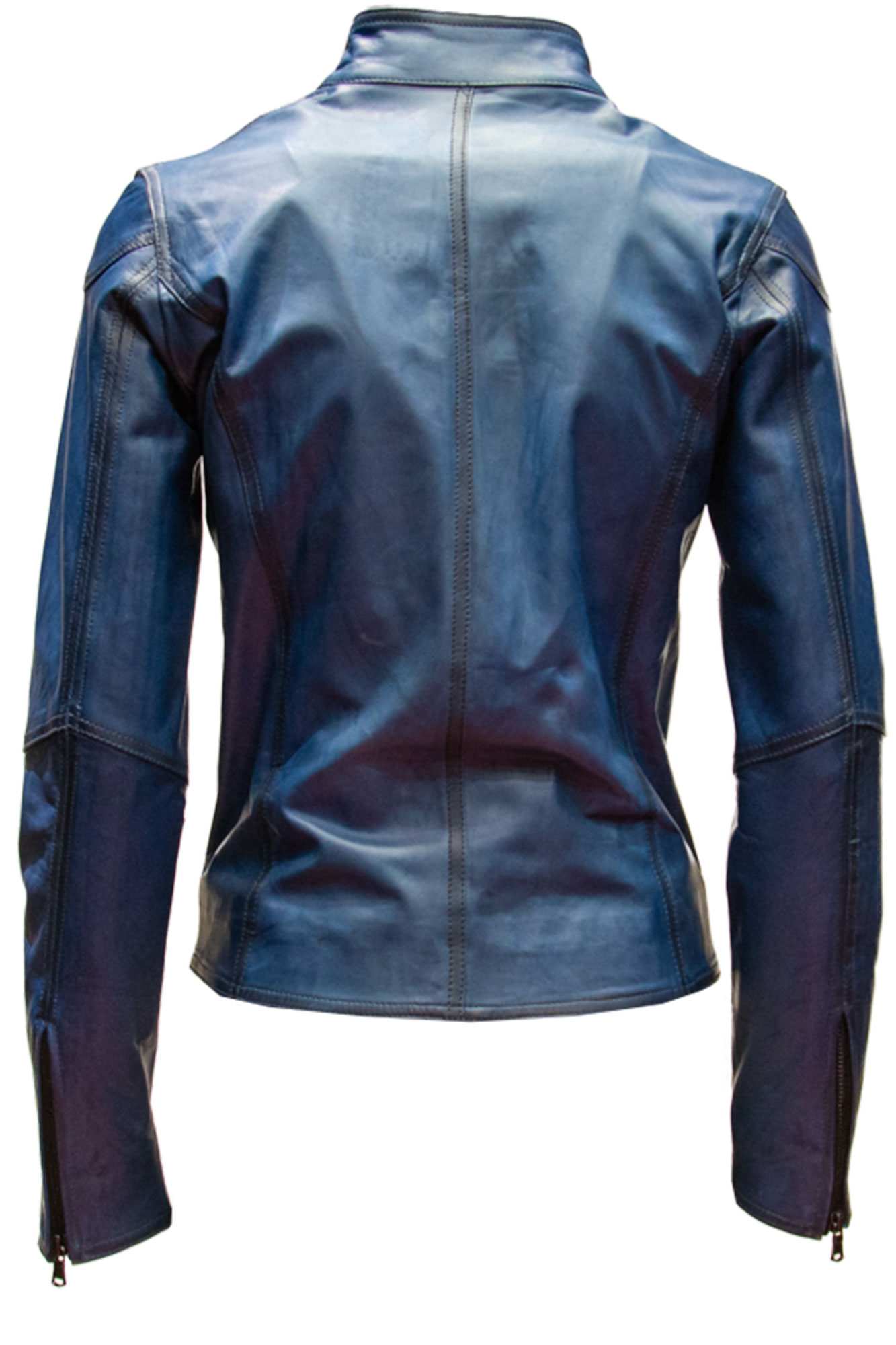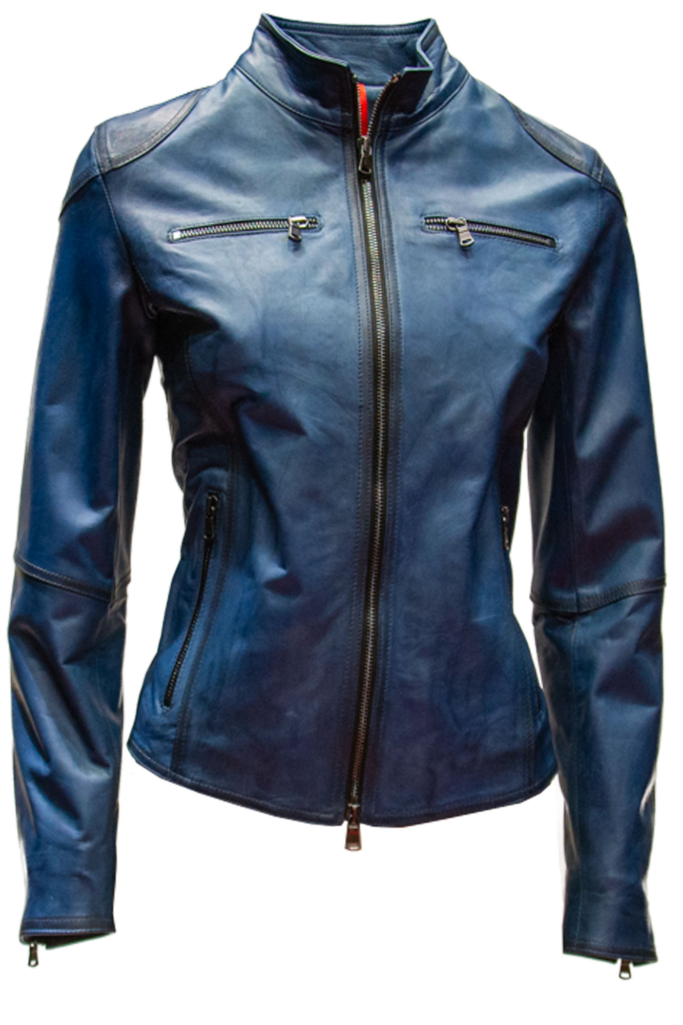 Giacca di pelle tamponata a mano, chiusura con zip, quattro tasche con chiusura zip, senza colletto.