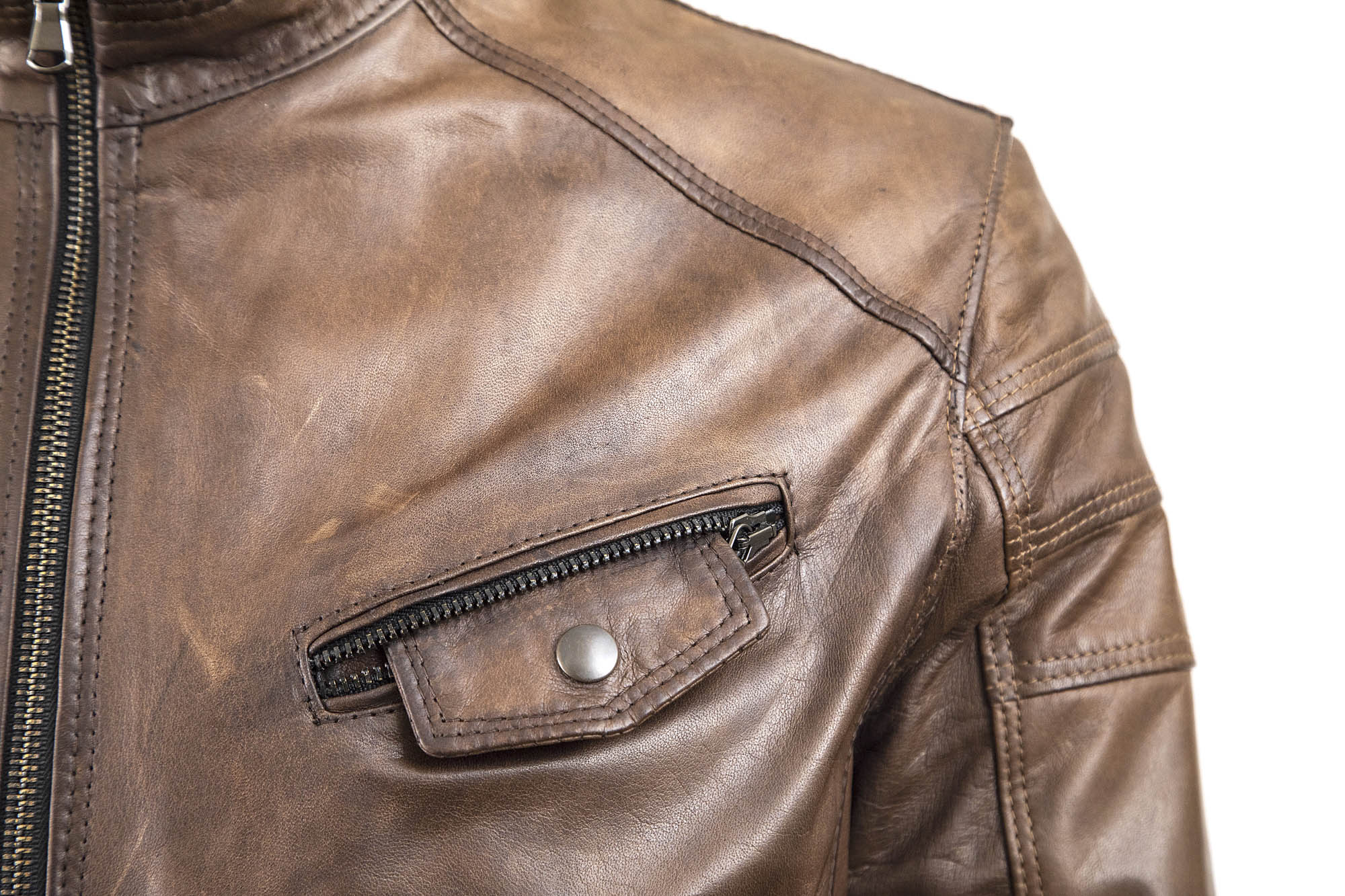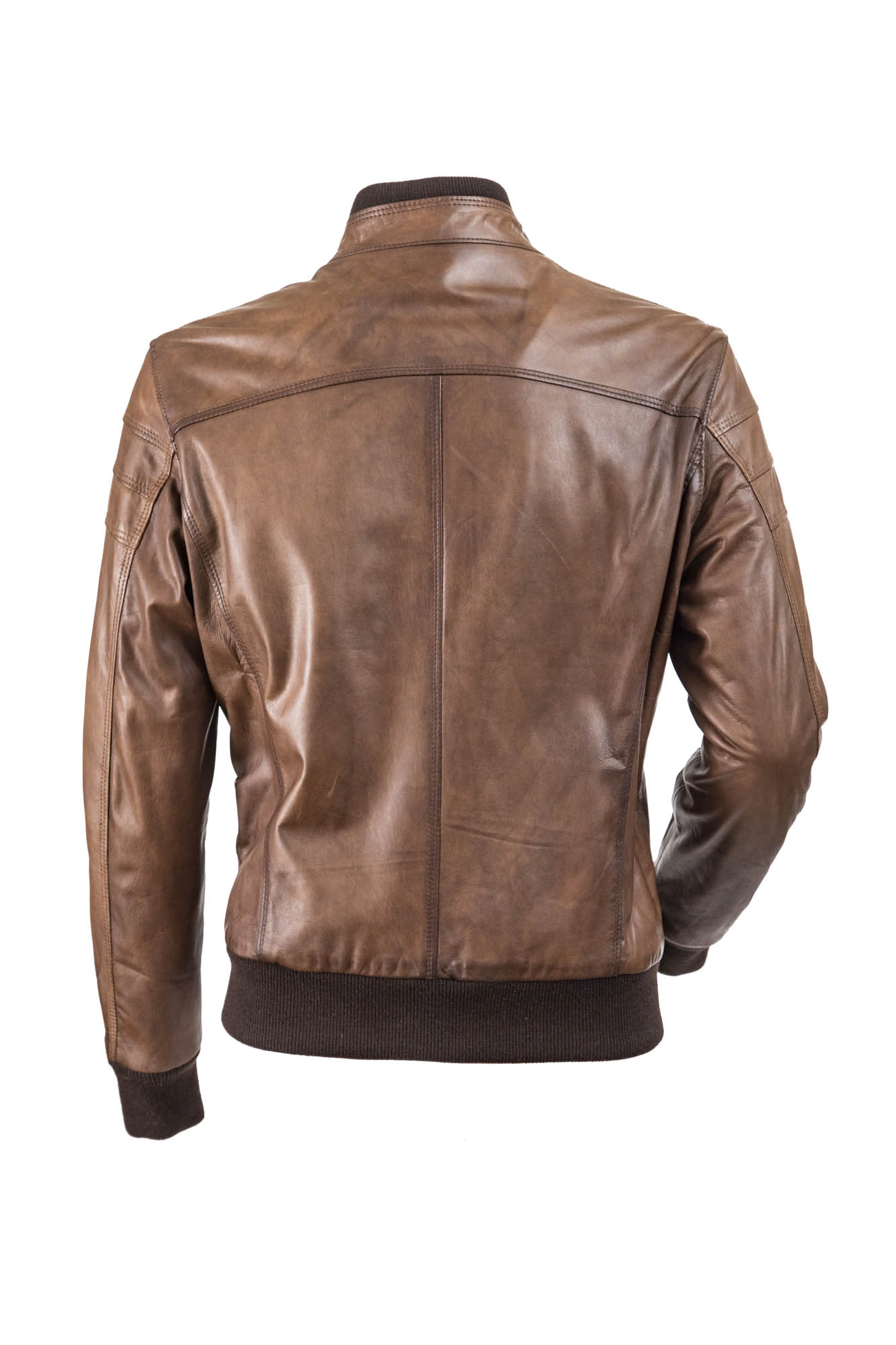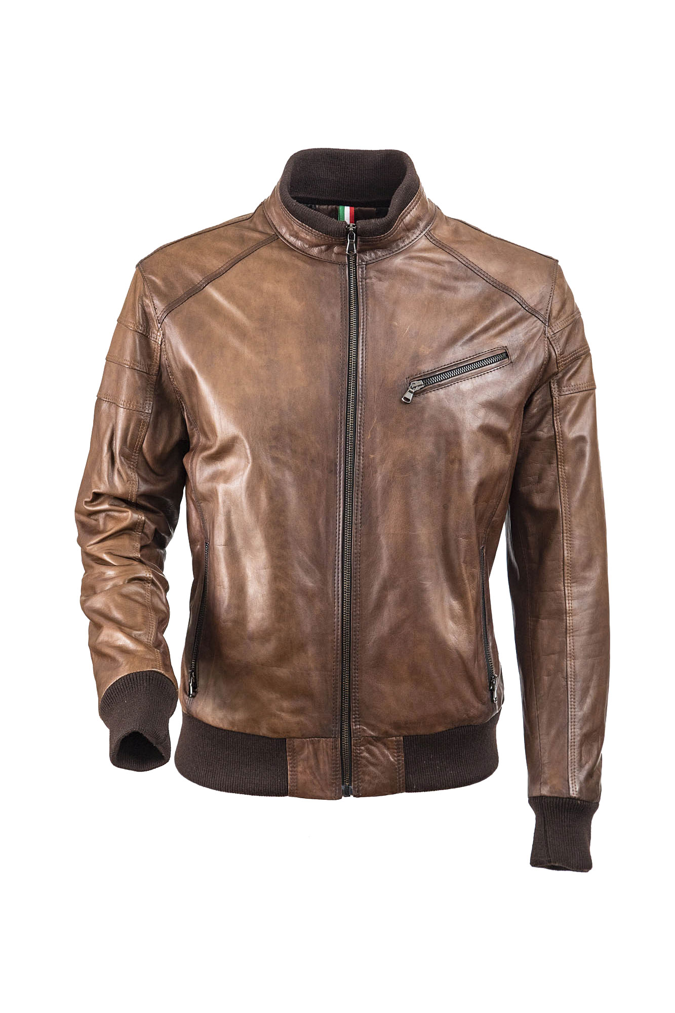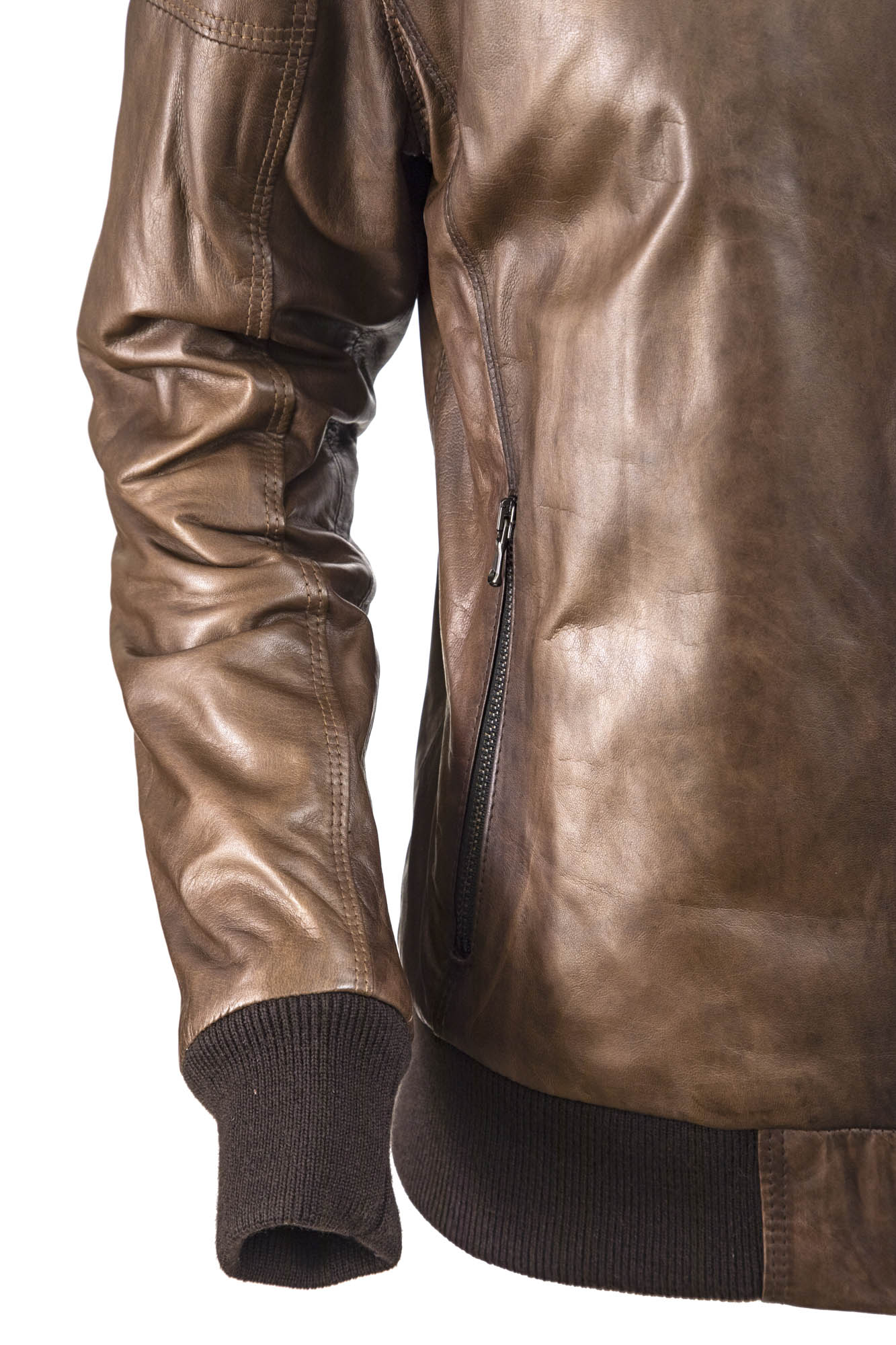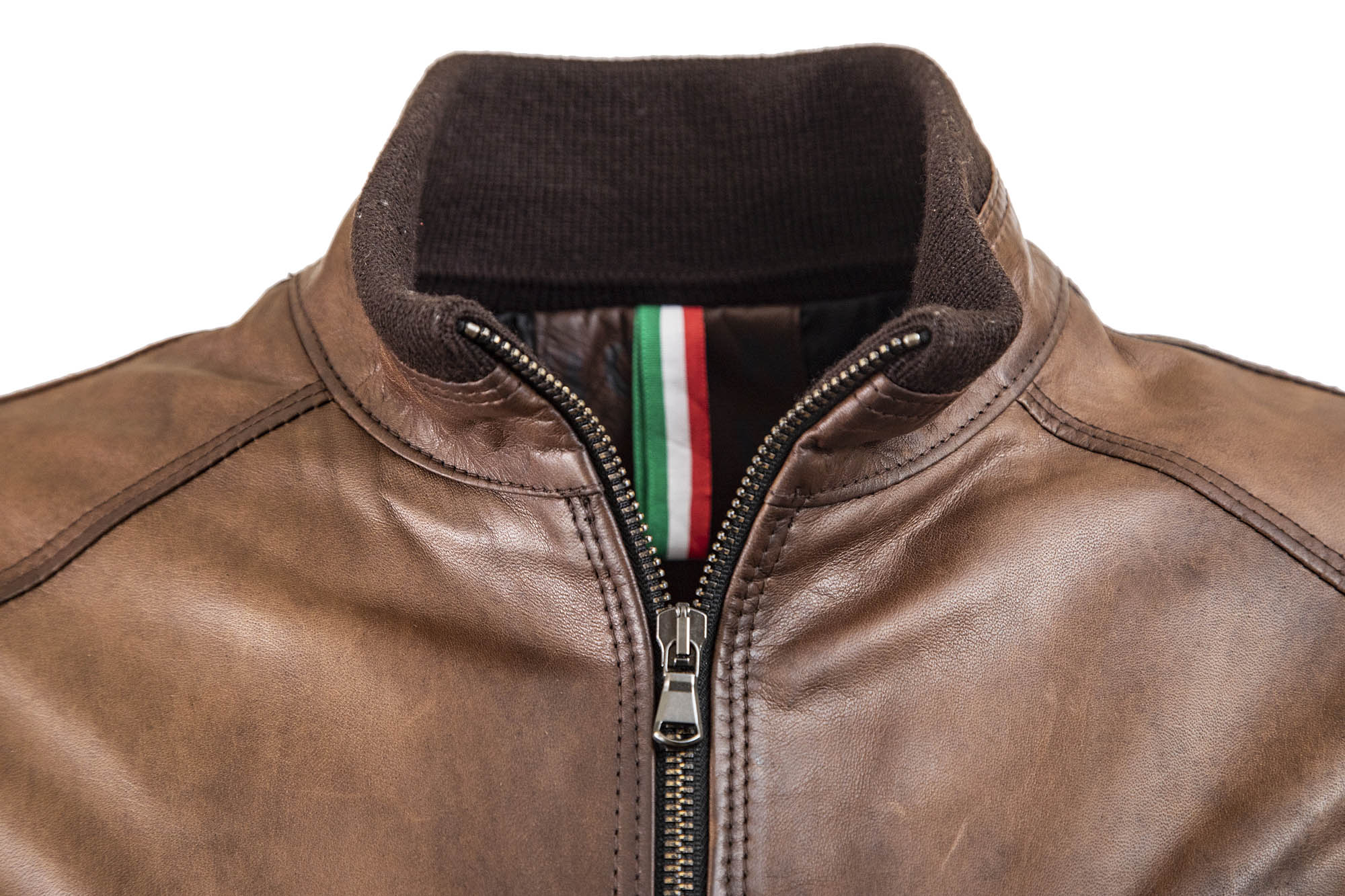 Giubbotto di pelle tamponato a mano. Chiusura in zip, doppio colletto con tessuto elastico, tre tasche chiuse con zip, di cui una con dettaglio chiusura con bottone a pressione. Imbottitura Thermore.