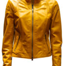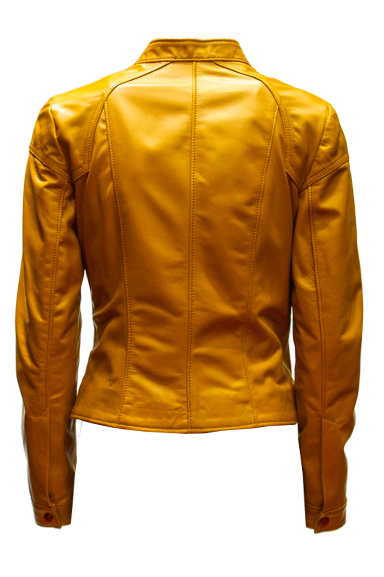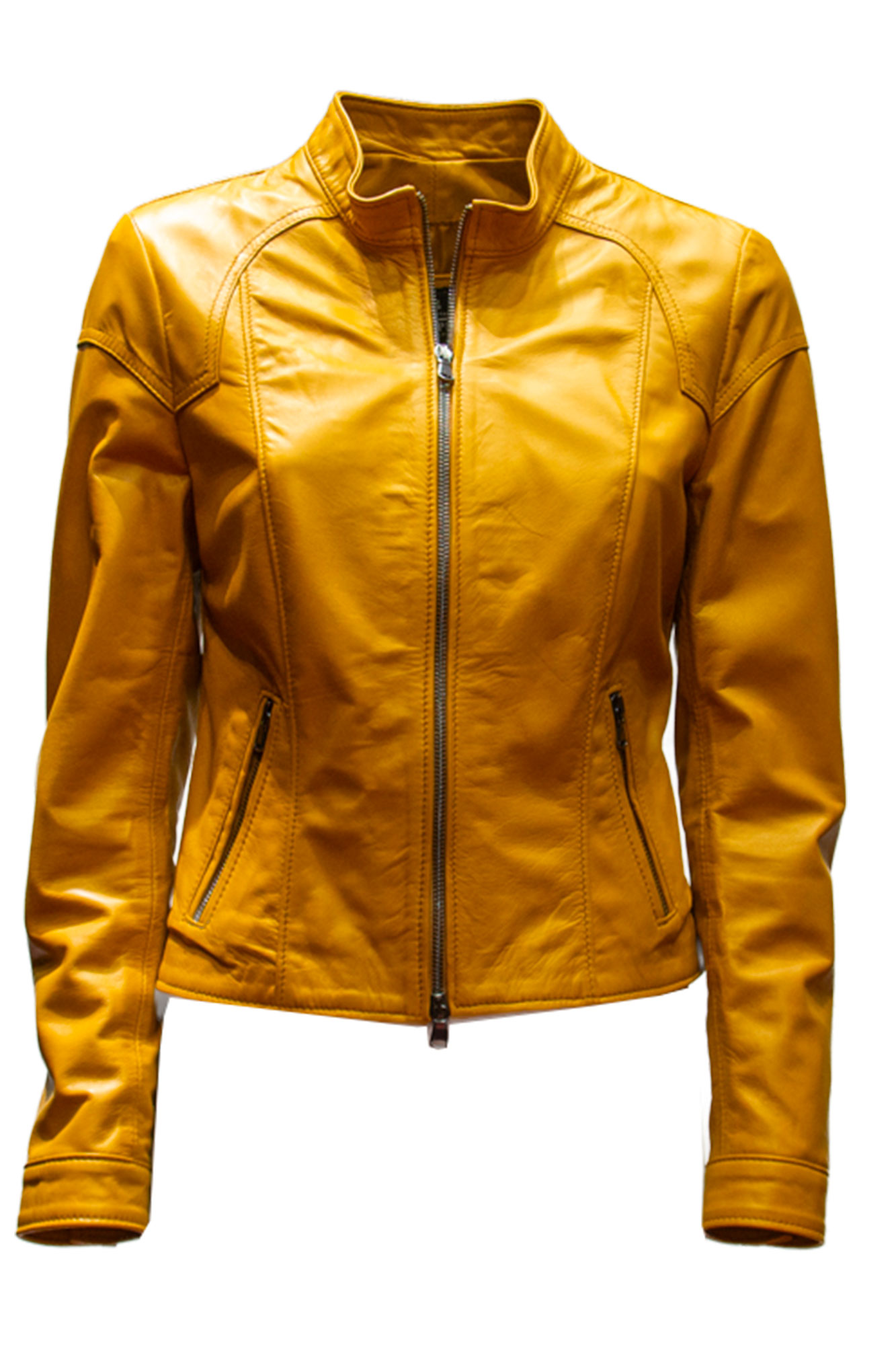Giubbotto di pelle tamponato a mano, modello biker, chiusura con zip.