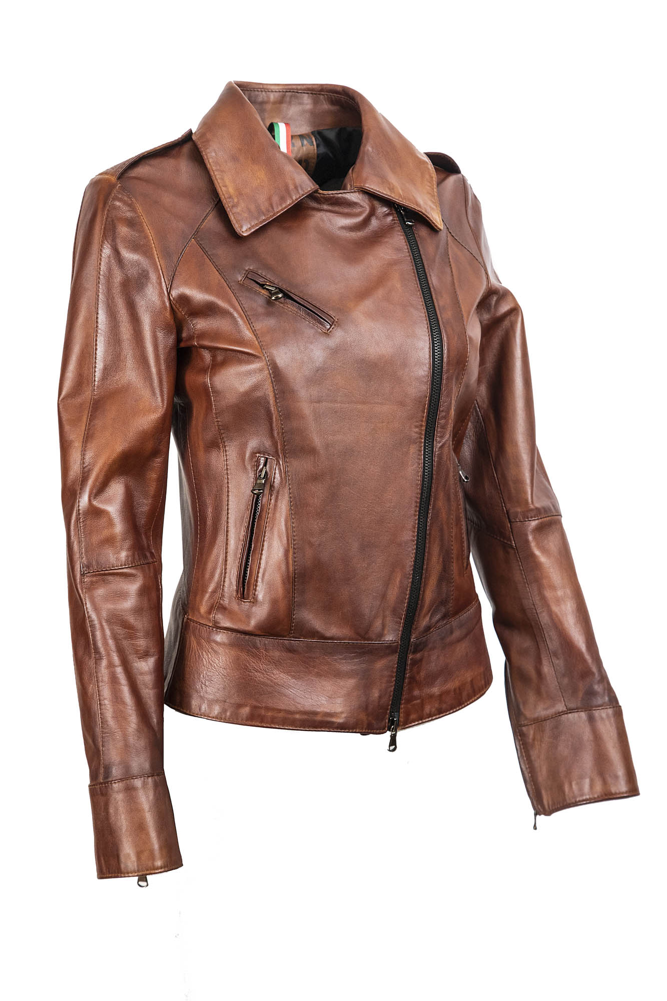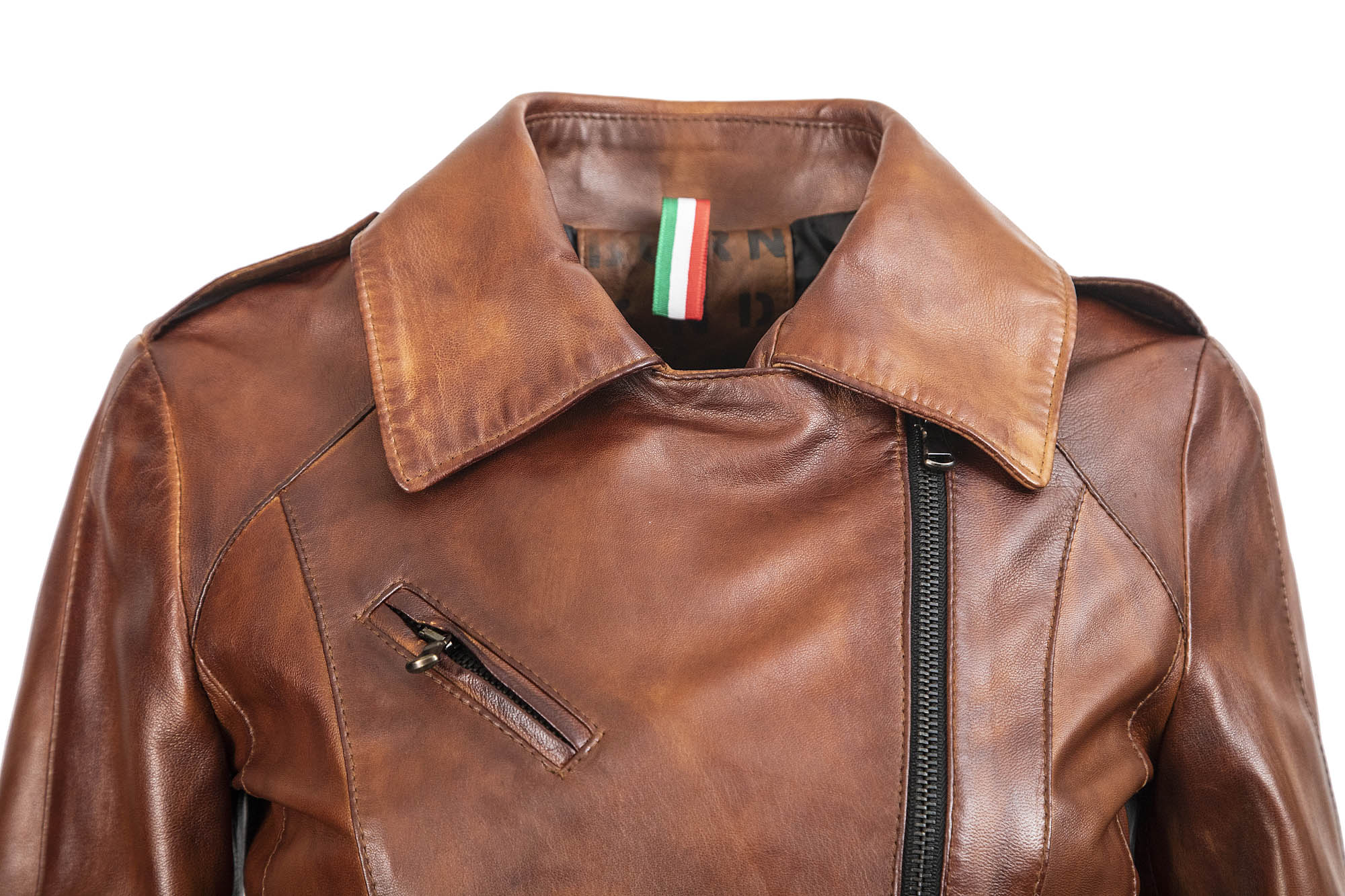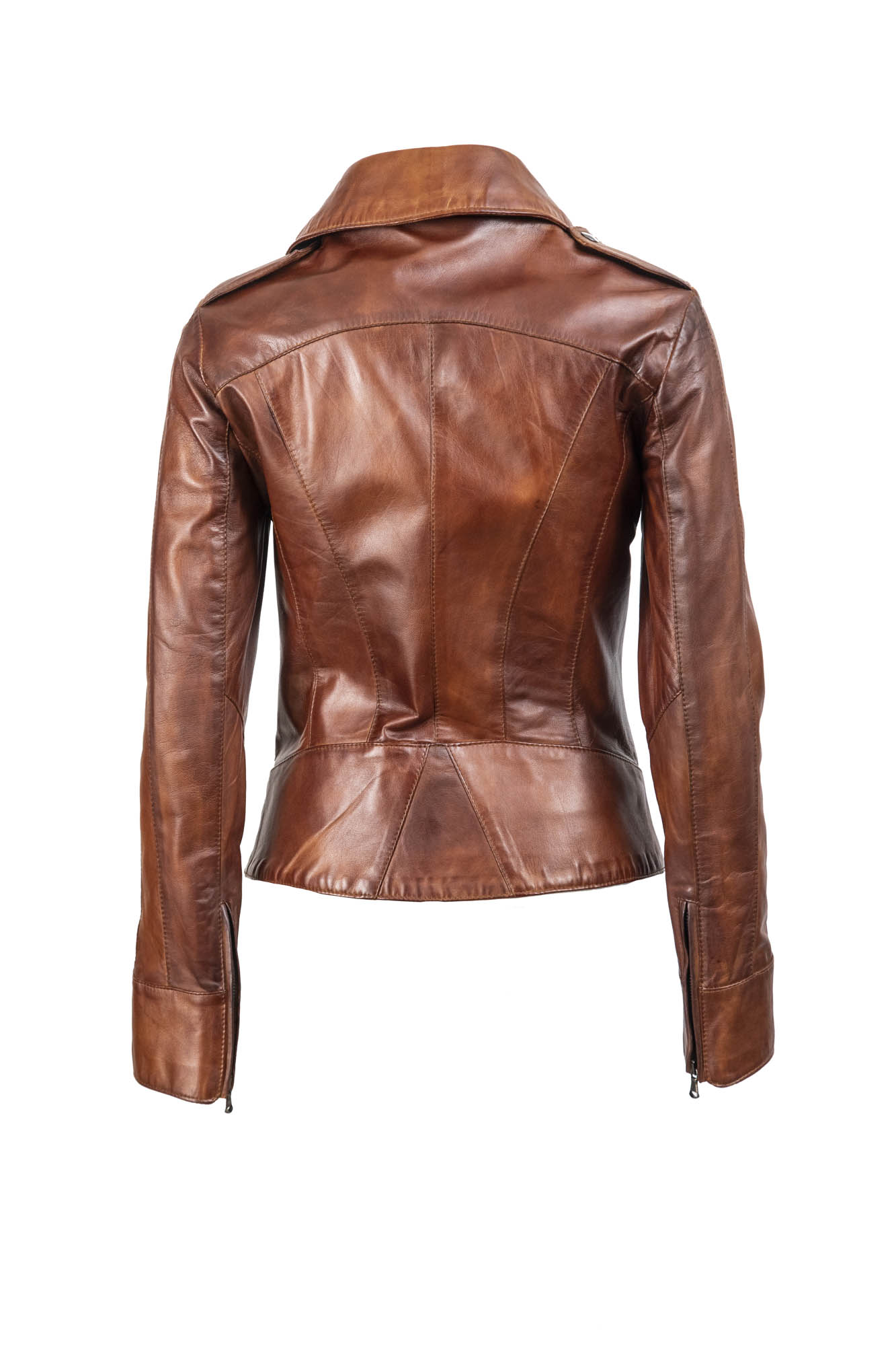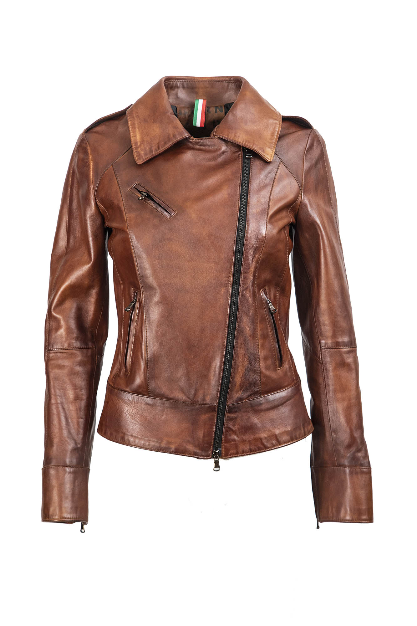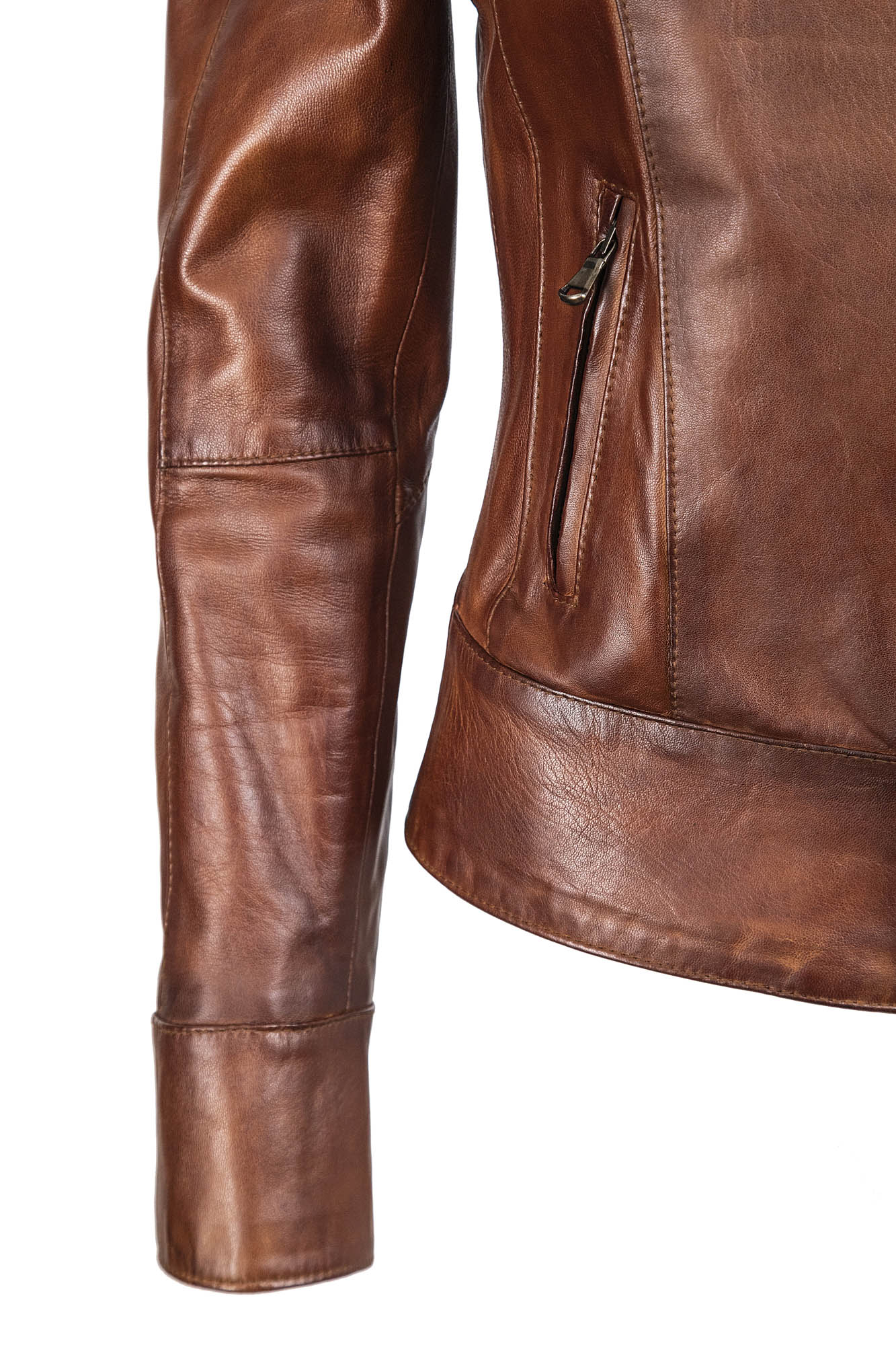Giacca di pelle tamponata a mano, chiusura con zip trasversale, tre tasche con chiusura zip, colletto.