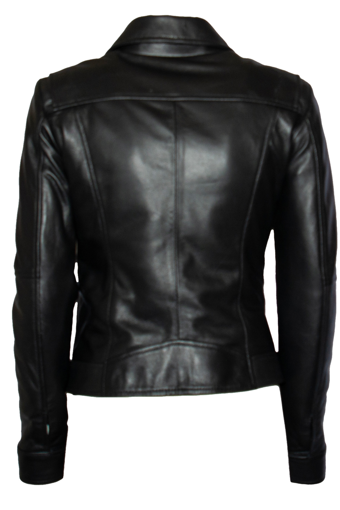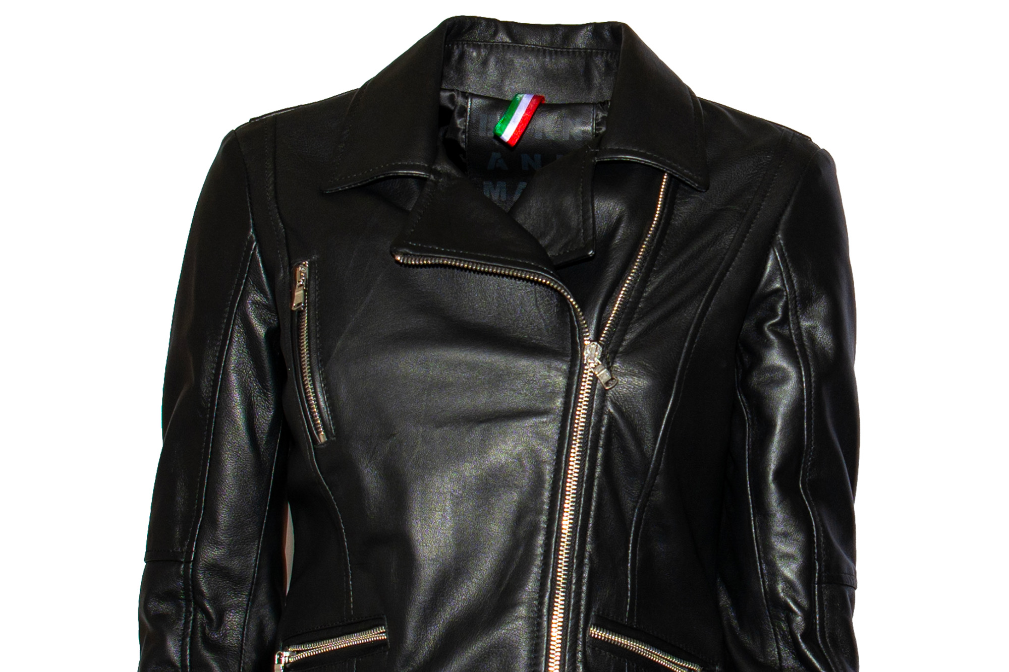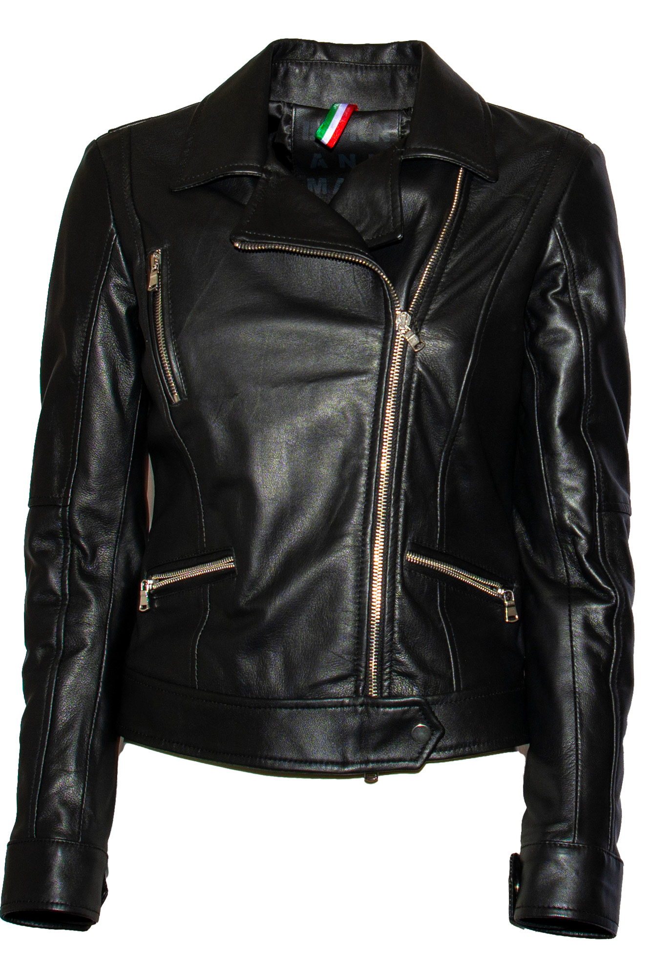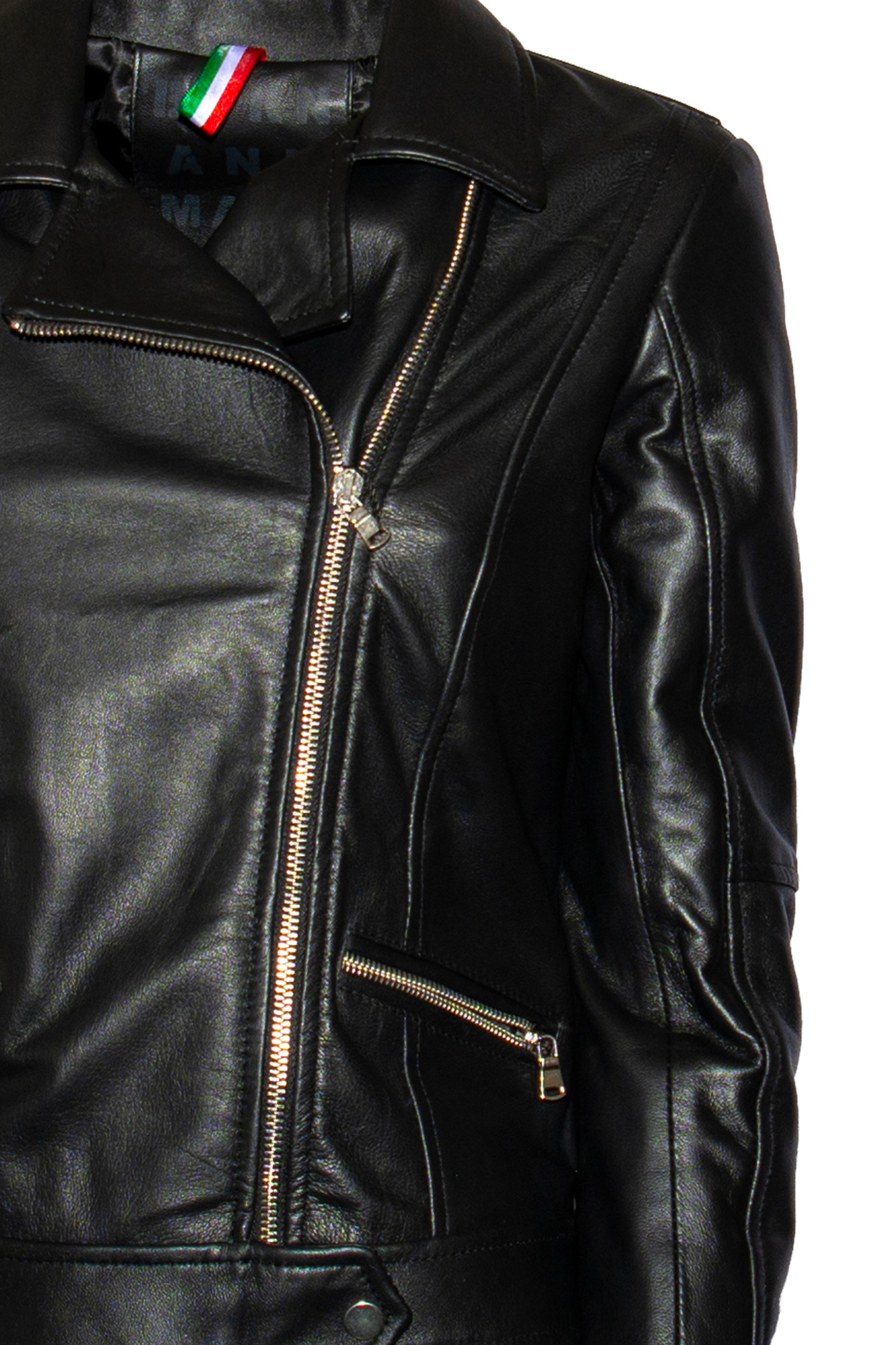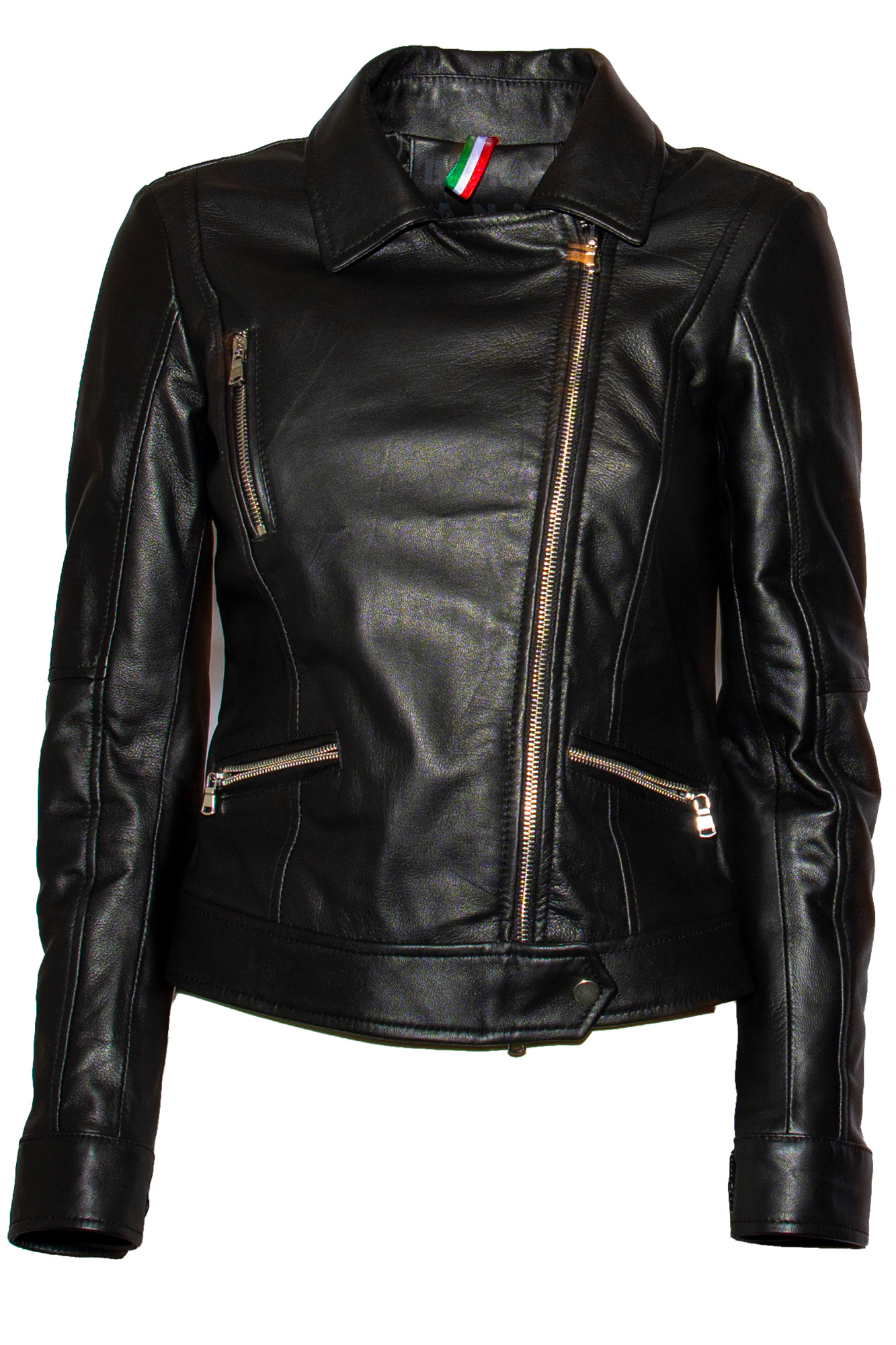 Giacca di pelle, chiusura zip trasversale, tre tasche con chiusura zip, chiusura con bottone a pressione all’estremità, colletto.
